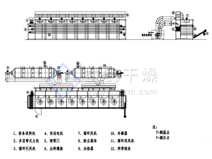 閉路循環帶式幹燥機可以采用(yòng)低溫熱泵型全(quán)循環(huán)多層帶式幹燥機或中溫閉路式多層帶式幹燥機(jī)。整個處理(lǐ)過程在密封過程中進行,可以保證整個流程無氣體排放、無(wú)粉塵泄露並且設備連接可靠、設備布置緊湊、生(shēng)產工(gōng)藝簡單、占地麵積小、設備投入少、節能環(huán)保。